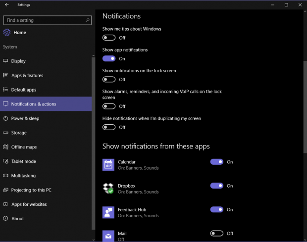 Vào Settings => System => Notifications & action, sau đó tắt tùy chọn Show me tips about Windows và tắt thông báo các ứng dụng cá nhân đi.