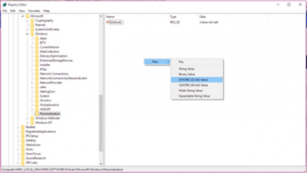4. Tại thư mục Personalization, nhìn sang khung bên phải, sau đó kích chuột phải vào khoảng trống bất kỳ chọn New => DWORD (32-bit) Value, đặt tên cho value này là NoLockScreen.