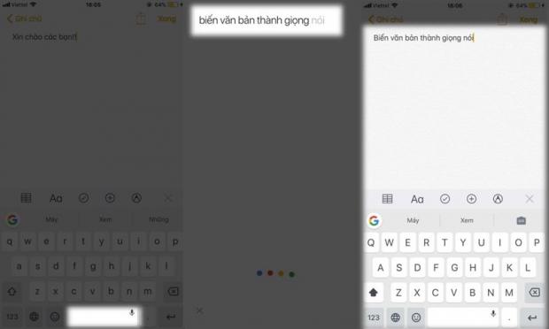 Trong giao diện bàn phím soạn thảo ở bất kỳ ứng dụng nào như: SMS, Ghi chú, Facebook, Web... các bạn chỉ cần bấm vào icon Micro như hình dưới sẽ xuất hiện giao diện ghi âm. Bạn chỉ cần nói thì sẽ chuyển sang văn bản rất nhanh.