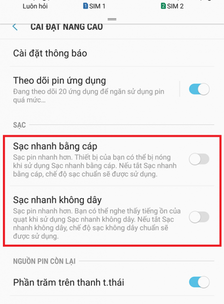 Bước 4: Ở bước này bạn sẽ thấy 1 loạt các “công tắc tắt/bật tính năng liên quan đến pin và sạc. Cái mà chúng ta cần quan tâm là hai mục Sạc nhanh bằng cáp/Sạc nhanh không dây. Bạn có thể vô hiệu hóa sạc nhanh bằng cáp và dây hoặc chỉ chọn 1 trong hai, tuy theo nhu cầu của bạn.