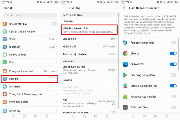 Để thực hiện, người dùng chỉ việc vào Cài đặt > Hiển thị > Hiển thị toàn màn hình. Tại đây, các bạn chọn những ứng dụng mình muốn hiển thị full màn hình là được.