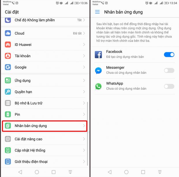 Khi vào Cài đặt, mọi người chọn mục Nhân bản ứng dụng ngay bên dưới. Sau đó bạn chỉ việc đợi một lúc để máy tạo thêm ứng dụng thứ 2 là có thể dùng bình thường.