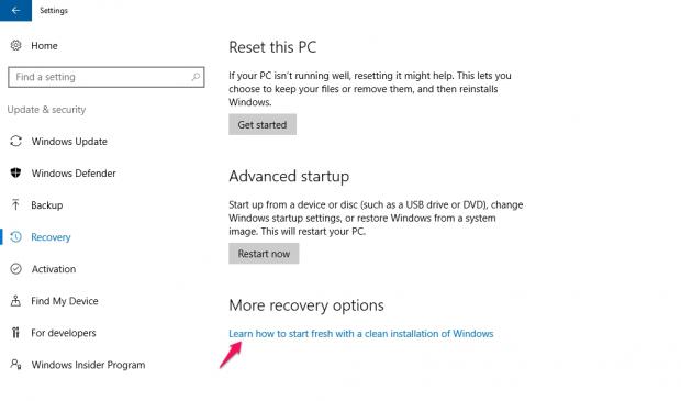 Click Start > Settings > Update & security. Chọn mục Recovery, click Learn how to start fresh with a clean installation of Windowsđể xem hướng dẫn sử dụng công cụ này, kèm với link Download Tool.