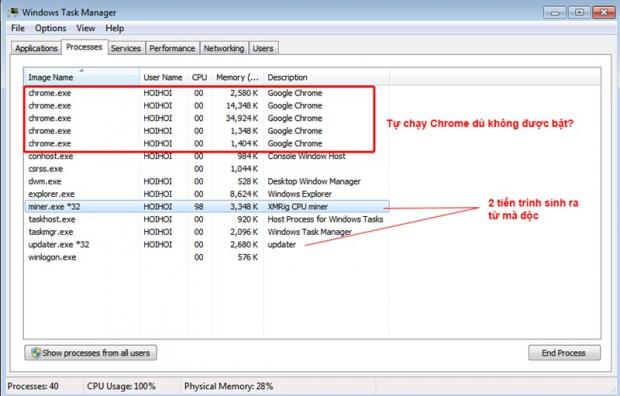 Tiếp đến, chúng sẽ tiến hành chạy hàng loạt các dịch vụ để phục vụ cho mục đích chính là đào tiền ảo, tất nhiên CPU của bạn sẽ bị tận dụng và lúc nào cũng 100%.