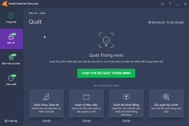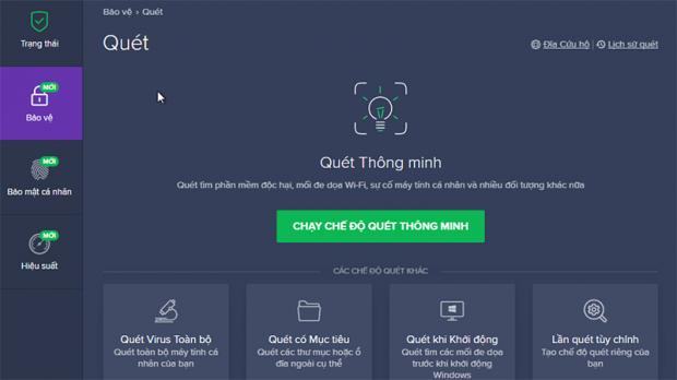 Bước 3: Tại giao diện chính, bạn chọn vào Bảo vệ > Quét > Chạy chế độ quét thông minh để tìm nhanh mã độc.