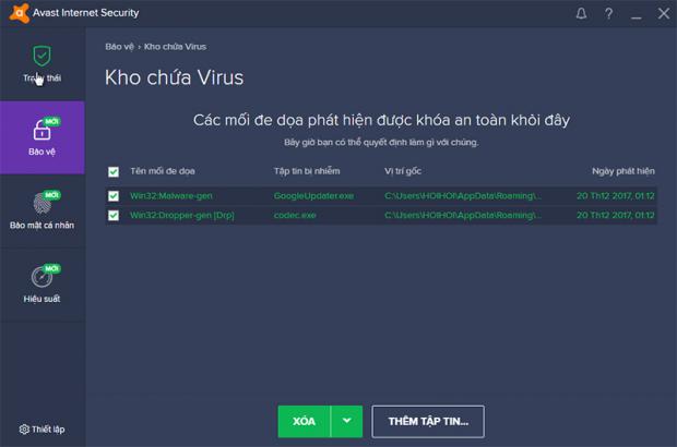 Bước 4: Sau khi quét xong bạn truy cập vào Bảo vệ > Kho chứa virus > Chọn toàn bộ virus, mã độc có trong danh sách > Xóa để tiêu diệt toàn bộ chúng khỏi máy tính.