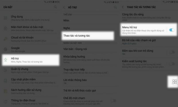 Các bạn vào phần Cài đặt > Hỗ trợ > Thao tác và tương tác > Tích bật Menu hỗ trợ. Trên màn hình sẽ hiện phím home ảo hình tròn.