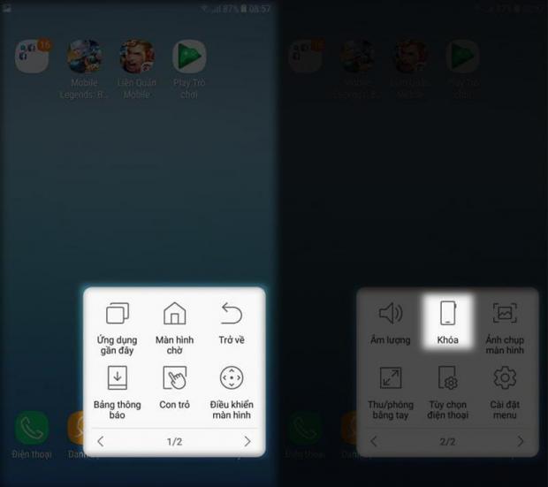 Khi bấm vào phím ảo, sẽ xuất hiện menu gồm rất nhiều tùy chọn và phím tắt nhanh, trong đó có Khóa màn hình. Các bạn bấm vào Tắt là màn hình sẽ khóa và mỗi lần muốn khóa màn hình các bạn nhấn 2 thao tác, bấm vào phím ảo và chọn Khóa.