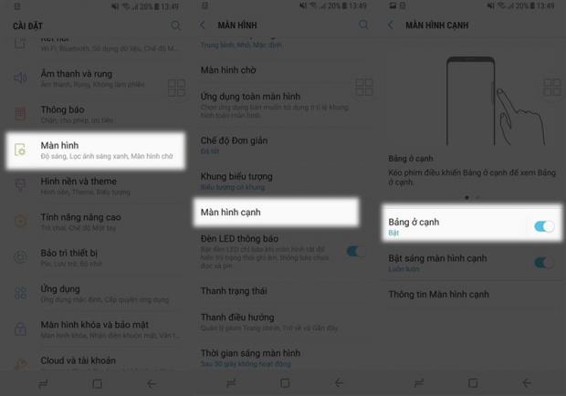 Trước hết các bạn phải bật tính năng màn hình cạnh lên trong phần: Cài đặt > Màn hình > Bảng ở cạnh.