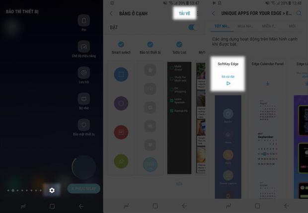Khi vuốt màn hình cong ra, các bạn bấm vào icon Cài đặt > Tải về > Trên kho Galaxy App các bạn download tiện ích SoftKey Edge và tích chọn nó vào menu màn hình cạnh.