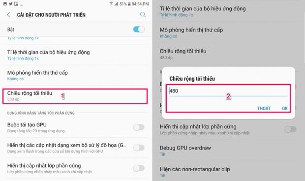 Quay về mục Cài đặt, vào Tùy chọn nhà phát triển - Chiều rộng tối thiểu và nhập vào số DPI mong muốn. DPI càng lớn sẽ cho nội dung hiển thị càng nhiều, vì thế hãy tự cân chỉnh để có kích thước tối ưu nhất.
