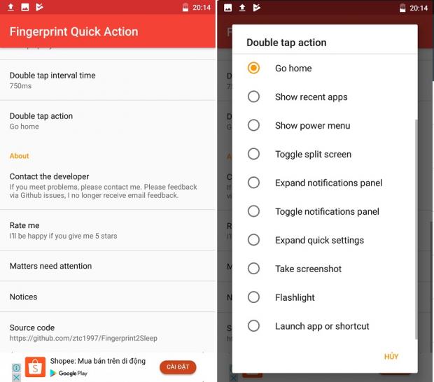 - Tương tự như Double tap action (chọn hành động khi nhấn 2 lần vào cảm biến vân tay).