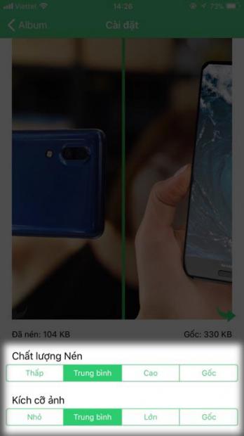 Khi bấm vào một album, xuất hiện 2 tùy chọn là Nén tất cả và Xóa tất cả. Các bạn chọn nén thì sẽ xuất hiện cửa sổ thông báo các thông tin gồm: Kích cỡ chưa nén và sau khi nén thì tiết kiệm được bao nhiêu dung lượng và chất lượng hình ảnh.