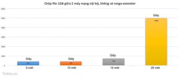 Ở bài test đầu tiên, mình chép file 1GB từ máy tính vào NAS ở các khoảng cách 5 mét, 10 mét, 15 mét và 25 mét, số trên biểu đồ là số giây hoàn thành tác vụ.