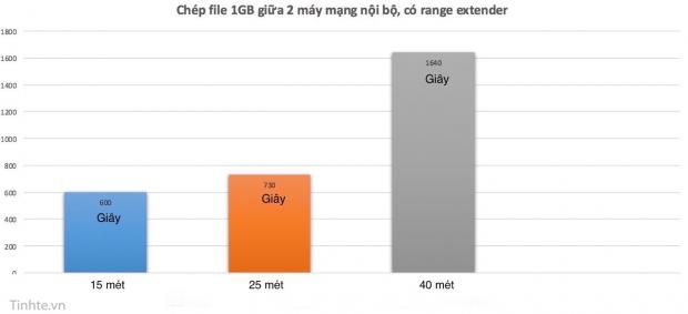 Bài test thứ 2 này, mình đã kích hoạt range extender, và kết nối laptop vào range extender, sau đó cũng tiến hành chép file 1GB vào NAS, kết quả cho thấy là range extender cải thiện rất tốt tình trạng yếu tốc độ. Như các bạn thấy, ở mức 15 mét thì tốc độ chép đã nhanh hơn khi kết nối trực tiếp vào router 619L, ở mức 25mét hoạt động vẫn còn rất tốt, ở mức 40 mét thì vẫn tốt hơn ở mức 25m nếu không có range extender.