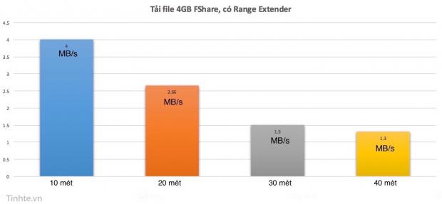 Bài test cuối này mình tải 1 file 4GB từ Fshare, máy kết nối vào range extender, mạng của mình do Viettel cung cấp, gói cước 45Mbps, ở khoảng cách 10 mét, mình tải được với tốc độ 4MB/s, đi xa đến 40 mét tốc độ tải vẫn còn ở mức khá ấn tượng là 1.3MB/s.