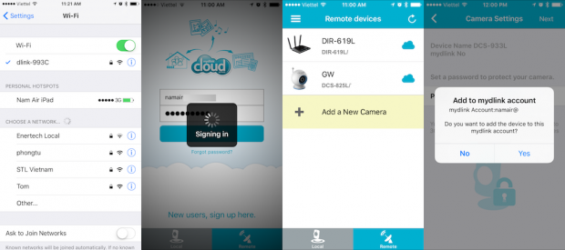 Ưu điểm khi sử dụng các camera DLink là mình thiết lập nó hết sức nhanh và đơn giản, chỉ cần cắm điện, kết nối điện thoại vào mạng wifi của camera phát ra, mở app myDlink, đăng nhập, nhấn nút Add Camera, sau đó nhấn nút WPS trên cam và router, chờ 1 lúc cho 2 cái bắt tay, sau đó gán tài khoản myDlink vào cam là xong. Từ đây, chỉ cần có kết nối internet, bạn có thể quan sát nhà cửa khắp mọi nơi.