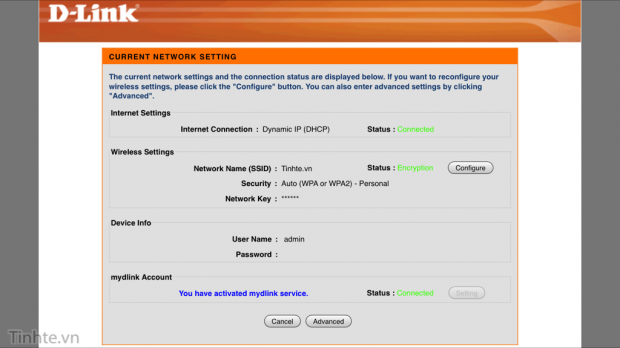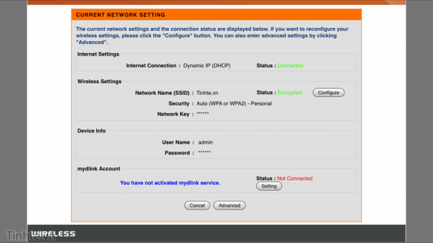 Xong xuôi, kích hoạt myDlink là hoàn tất, lúc này bạn có thể tắt và sử dụng router này rồi, nếu các bạn quan tâm đến các thiết lập nâng cao thì nhấn nút Advanced, còn không thì tắt đi là xài thôi