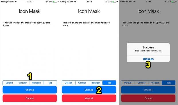 Mở chức năng Icon Mask > chọn kiểu icon mẫu (circular, hexagon, tag) > nhấn nút Change để thay đổi và Reboot lại thiết bị để áp dụng thiết lập mới.