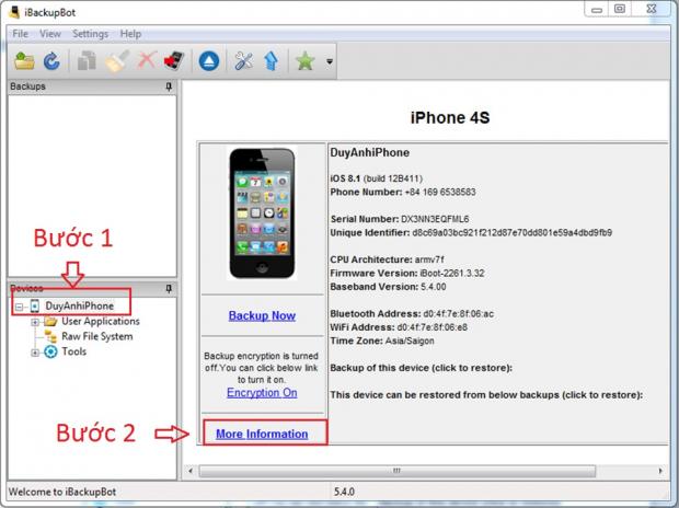 Bước 3: Sau khi cài đặt, các bạn chạy phần mềm iBackupBot và kết nối iPhone với máy tính bằng cáp rồi dùng chuột nhấp vào các phần được đánh dấu trong bức ảnh. Ví dụ ở đây mình sẽ chọn 'DuyAnhiPhone' (tên iPhone của mình) và sau đó chọn tiếp 'More Infomation'.