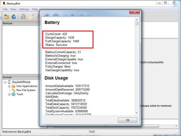 Cụ thể như trong hình các bạn sẽ thấy chiếc iPhone 4s của mình có số lần sạc là 422 lần, dung lượng pin ban đầu là 1.430mAh và dung lượng pin hiện tại cao nhất đạt được là 1.400mAh. Như vậy viên pin trên iPhone của mình còn bị chai mất khoảng 2% tức là chỉ bằng 98% ban đầu.