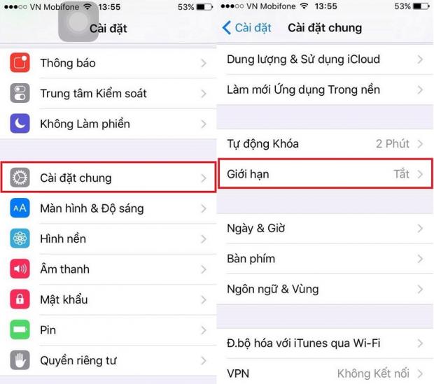 Để thực hiện các bạn vào Cài đặt > Cài đặt chung > Giới hạn.