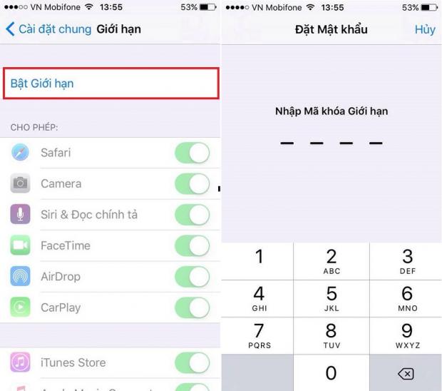Tại đây bạn nhấp chọn Bật giới hạn, máy sẽ yêu cầu nhập mã giới hạn, password này bao gồm 4 chữ số, sau khi nhập xong bạn nhập lại 1 lần nữa để xác nhận.