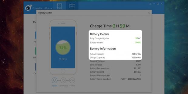 Sau khi tải về và cài đặt, mở phần mềm 3uTools lên và tiến hành kết nối iPhone với máy tính bằng cáp sạc. Ở phần Info (Thông tin) của phần mềm, ở phía bên tay phải bạn sẽ thấy thông tin về số lần bạn đã sạc đầy 100% pin và chất lượng pin còn lại.
