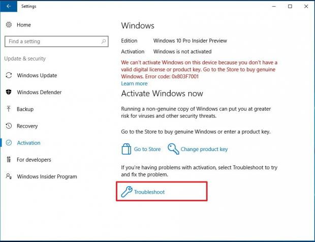 4. Nếu nhìn thấy trạng thái thông báo kích hoạt: Windows is not activated, bạn click chọn Troubleshoot để tiếp tục. (Lưu ý, tài khoản của bạn phải hoàn toàn dưới quyền Admin trong quá trình thực hiện).