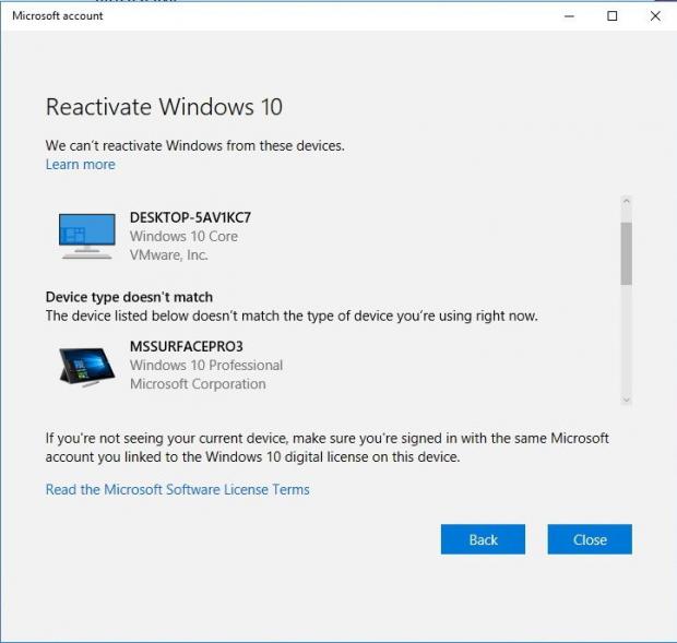 Trên cửa sổ này bạn sẽ nhìn thấy danh sách các thiết bị được chia là 3 mục: Edition doesn't match, Device type doesn't match, and Windows isn't activated, giải thích vì sao Windows 10 không thể kích hoạt từ các thiết bị khác.