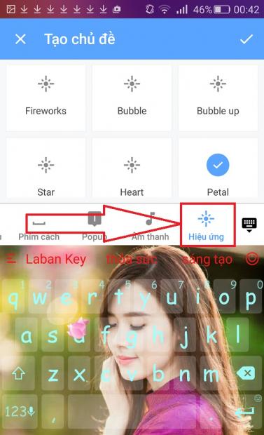Tiếp theo, bạn chọn vào tab Hiệu ứng, có 9 hiệu ứng khi gõ phím rất đẹp mắt cho bạn lựa chọn như: pháo hoa, bong bóng, ngôi sao, trái tim,...