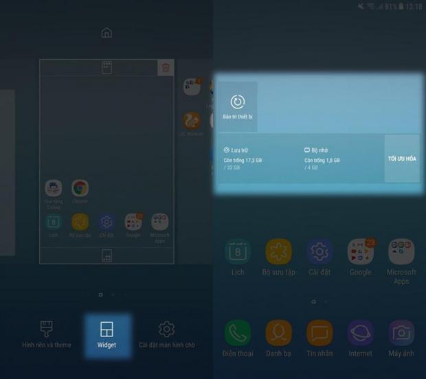 Tại trang chính, các bạn nhấn giữ màn hình > Bấm Widget Chúng ta có thể chọn các phím tắt nhanh của trình bảo trì thiết bị, ghi chú, ... và lôi ra màn hình chủ.