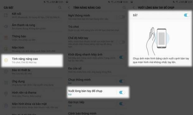 Thao tác này giúp chụp ảnh màn hình nhanh hơn rất nhiều mà không cần thao tác tới phím cứng. Các bạn vào phần Cài đặt > Tính năng nâng cao > Tích bật Vuốt lòng bàn tay để chụp là được nhé.
