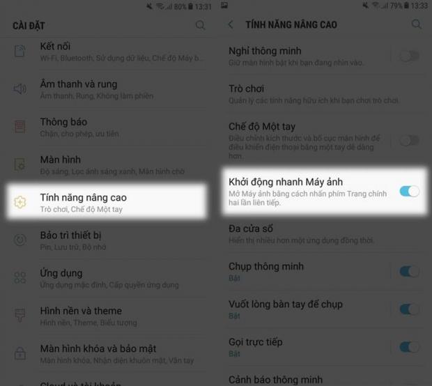Phím tắt này sẽ giúp các bạn khởi động nhanh camera những lúc cần chụp ảnh nhanh để không bị lỡ những khoảnh khắc đẹp nào. Nhưng trước hết các bạn phải kích hoạt lên trong phần: Cài đặt > Tính năng nâng cao > Tích bật Khởi động nhanh Máy ảnh.