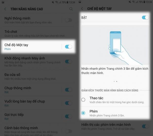 Mẹo này sẽ hữu ích với những máy có màn hình lớn. Nhưng để thao tác thêm tiện lợi hơn các bạn tùy chỉnh trong phần Cài đặt > Tính năng nâng cao > BẬT.