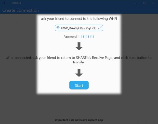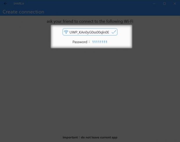 Phần mềm sẽ tư tạo 1 kết nối mạng nội bộ giữa 2 máy để truyền tệp. Mạng này sẽ hiển thị tên và mật khẩu.
