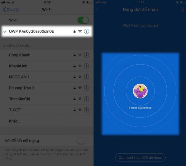 Quay lại iPhone, các bạn vào phần Cài đặt > Wifi. Các bạn kết nối iPhone với mạng wifi mà phần mềm trên đã tạo, xong các bạn mở lại ứng dụng Share.it > Chọn NHẬN.