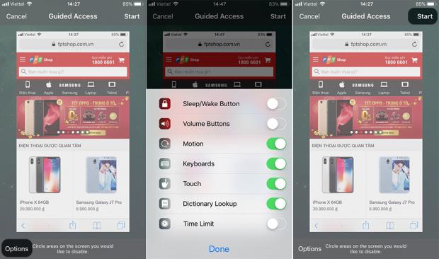 Bước 4: Giờ hãy vào ứng dụng mà bạn muốn khóa trên iPhone, sau đó ấn nút Home 3 lần. Lúc này trên màn hình sẽ hiện ra tùy chọn để bắt đầu khóa ứng dụng.