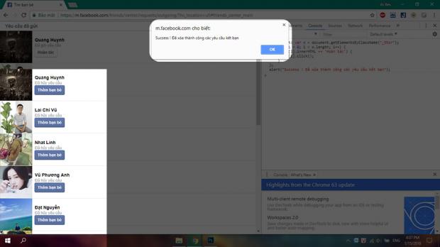 Sau khi nhấn Enter, lệnh sẽ nhanh chóng được thực thi. Đến khi nhận được bảng thông báo “Đã xóa thành công các yêu cầu kết bạn” là thành công. Giờ bạn hãy nhìn vào danh sách bạn đã gửi yêu cầu kết bạn, tất cả đã chuyển sang nút thêm lại bạn bè có nghĩa là bạn đã thực hiện thành công.