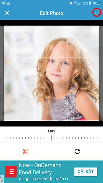 Sau khi chọn xong, bạn có thể thu phóng tùy chính kích thước ảnh theo mong muốn rồi nhấn phím dấu tích ở góc trên để tiếp tục.