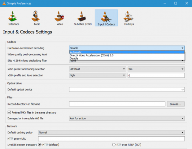 Tiếp theo click chọn thẻ Input/Codes, sau đó tìm tùy chọn Hardware-accelerated Decoding dưới mục Codecs và thiết lập tùy chọn là Automatic.