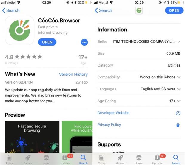 Chỉ cần iPhone được tải trình duyệt Cốc Cốc trên Appstore. Trình duyệt có dung lượng gốc tầm 57MB và có thể phát sinh tăng khi chứa thêm dữ liệu cache.