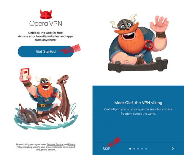 Bước 2: Khởi động Opera Free VPN > Get Started để chấp nhận các điều khoản > SKIP để bỏ qua giới thiệu (hoặc bạn có thể lướt sang trái để đọc hướng dẫn).
