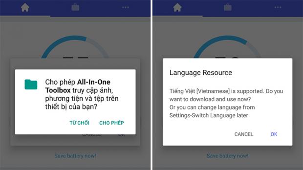 Lúc khởi động đầu tiên, bạn cần cấp phép cho All-In-One Toolbox quyền truy cập (bộ nhớ), lúc này hệ thống sẽ tự nhận diện ngôn ngữ trên máy và chuyển sang Tiếng Việt.