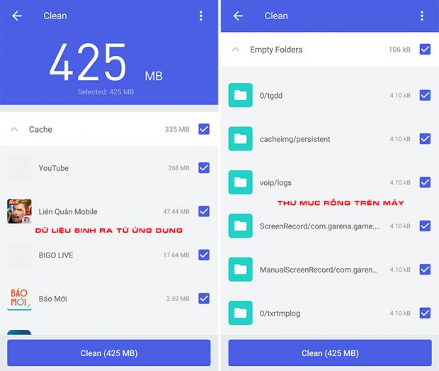 Tính năng xóa dữ liệu ứng dụng phình to và xóa thư mục rỗng.