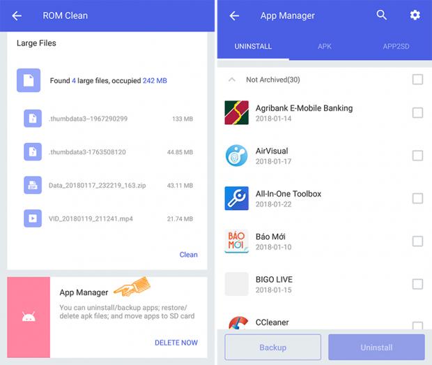 Bạn cũng có thể chọn vào mục App Manager dưới cùng để kích hoạt tính năng gỡ bỏ hoặc sao lưu hàng loạt ứng dụng cùng lúc hay xóa file APK đã tải về trước đó nhằm tiết kiệm không gian lưu trữ.