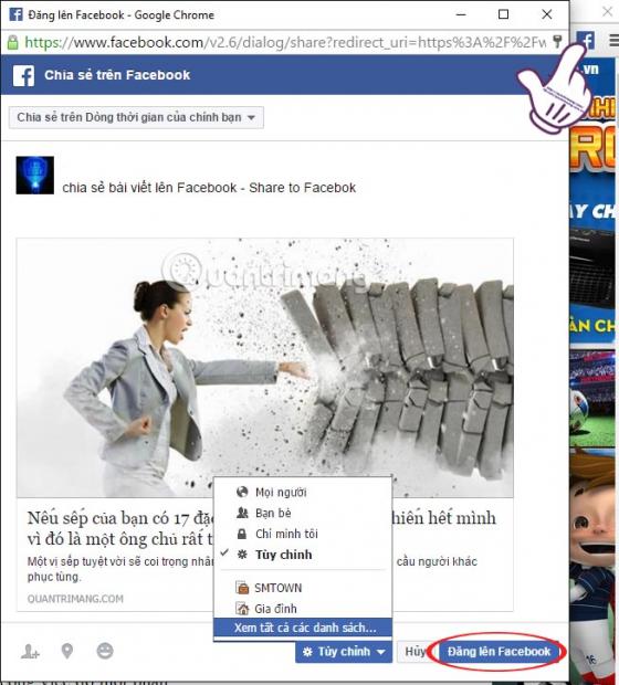 Chúng ta cũng thực hiện thao tác viết status cho bài viết, tag tên, thiết lập chế độ hiển thị bài chia sẻ, thêm hoạt động, hay cảm nghĩ,... như những bài viết thông thường khác. Cuối cung nhấn Đăng lên Facebook là xong rồi đó.