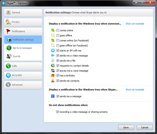 Cửa sổ thiết lập các thông số Notifications sẽ hiển thị, có nhiều lựa chọn dành cho bạn và bạn chỉ cần tick hoặc bỏ tick những lựa chọn tùy thuộc vào nhu cầu của mình. Ví dụ như hình ảnh bên trên, tôi đã thiết lập để Skype KHÔNG THÔNG BÁO khi có ai đó online, offline, online trên Facebook, offlice trên Facebook. Còn lại tất cả đều thông báo.
