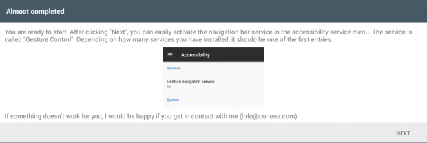 Sau khi hoàn tất, nhấn Next, và thoát ra ngoài là các chức năng đã được kích hoạt. Trong trường hợp không muốn sử dụng nữa nhưng lại không xóa ứng dụng, chỉ tạm thời tắt chức năng của Gesture Control: Truy cập Cài đặt - Khả năng truy cập - chuyển sang off ở mục Gesture Navigation Service.