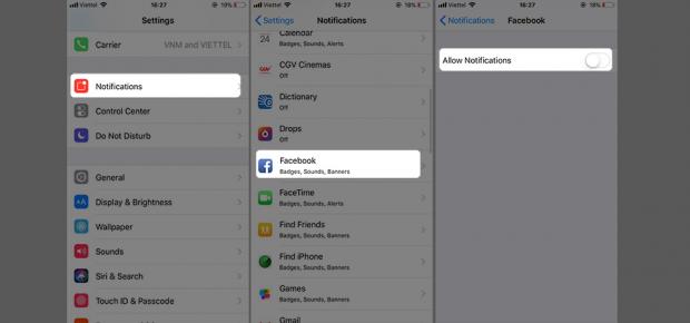 Việc tắt Notifications trên iPhone không chỉ giúp bạn tập trung hơn trong công việc, mà còn hạn chế việc iPhone sáng màn hình liên tục gây tốn rất nhiều pin.Để tắt Notifications bạn hãy tiến hành trụy cập vào: Settings > Notifocations > Tìm ứng dụng Facebook và kéo thanh Allow Notifications sang trái để tắt.